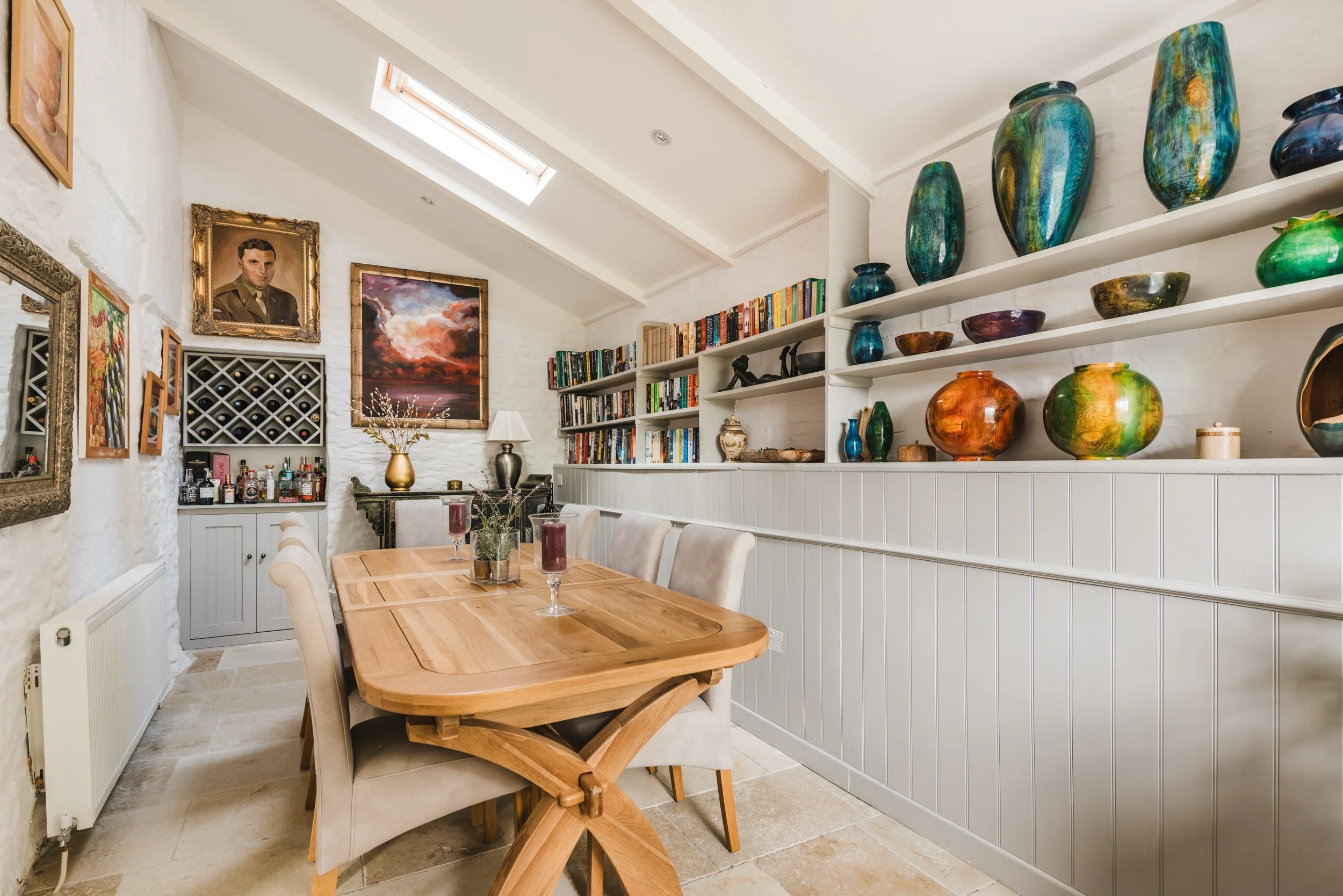 A separate dining room with room for a long table is accessed through a useful study/office area, while the sitting room lies at the rear of the house with its granite fireplace and access through to the utility room, a bathroom and rear staircase.